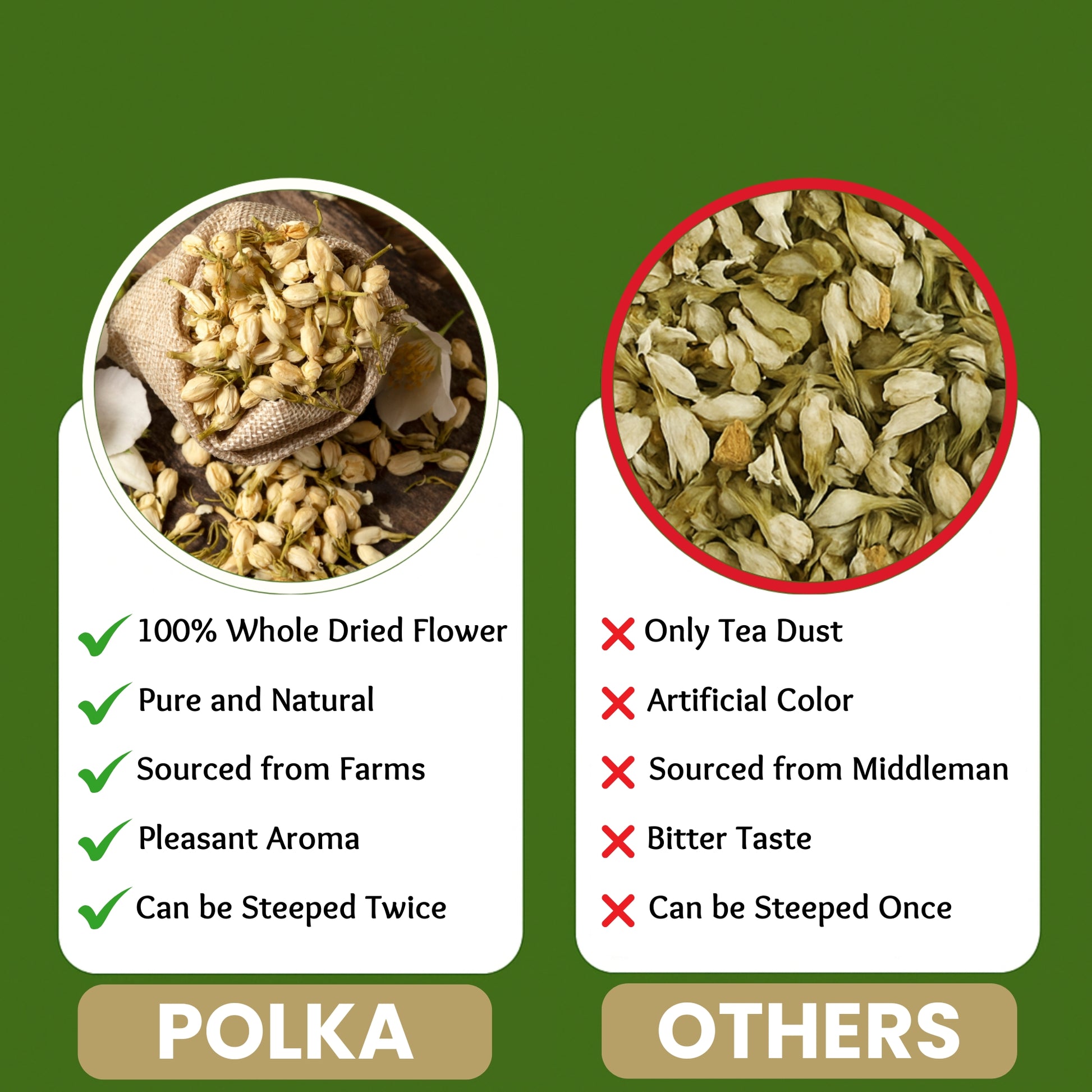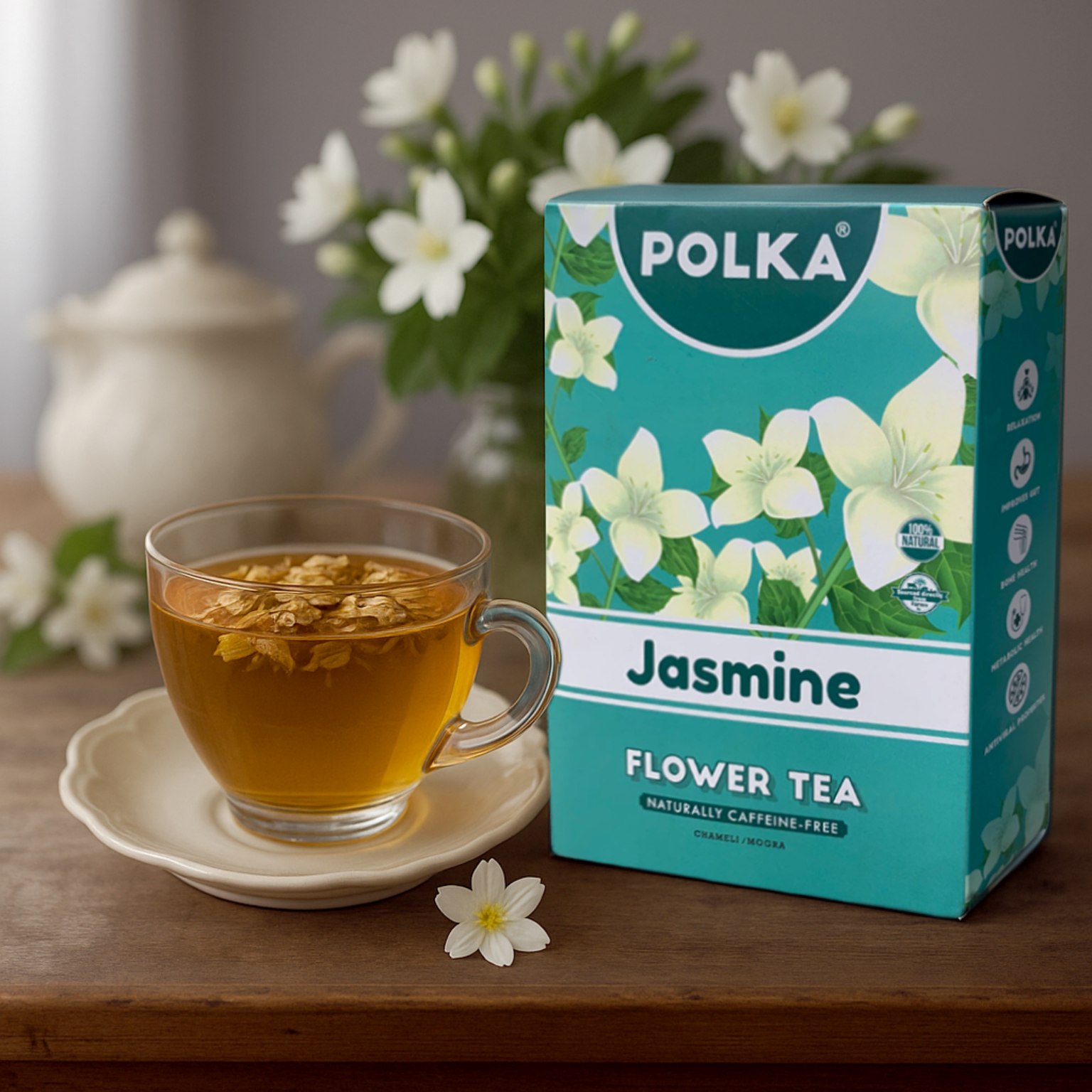 Delicate, fragrant, and calming—Polka’s Jasmine Flower Tea is a timeless favourite. Handpicked Chameli/Mogra blooms are naturally dried to preserve their soothing aroma and benefits.